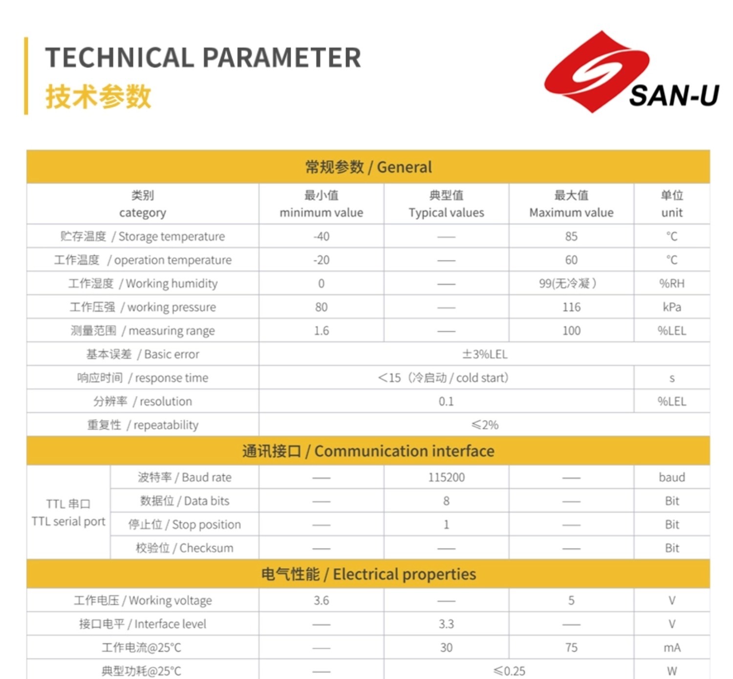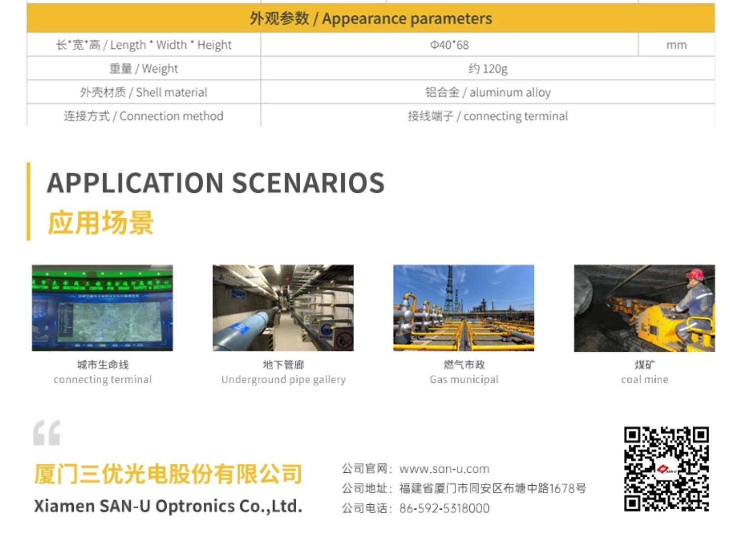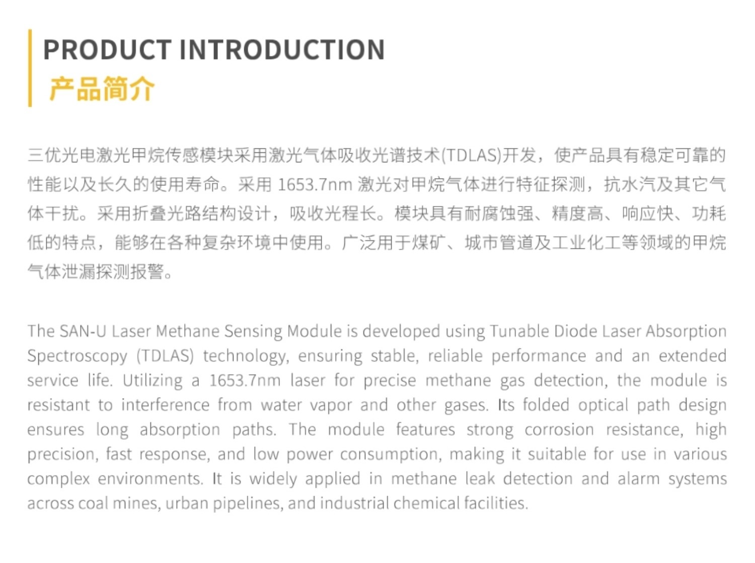三优光电激光甲烷传感模块采用激光气体吸收光谱技术(TDLAS)开发,使产品具有稳定可靠的性能以及长久的使用寿命。采用1653.7nm激光对甲烷气体进行特征探测,抗水汽及其它气体干扰。采用折叠光路结构设计,吸收光程长。模块具有耐腐蚀强、精度高、响应快、功耗低的特点,能够在各种复杂环境中使用。广泛用于煤矿、城市管道及工业化工等领域的甲烷气体泄漏探测报警。